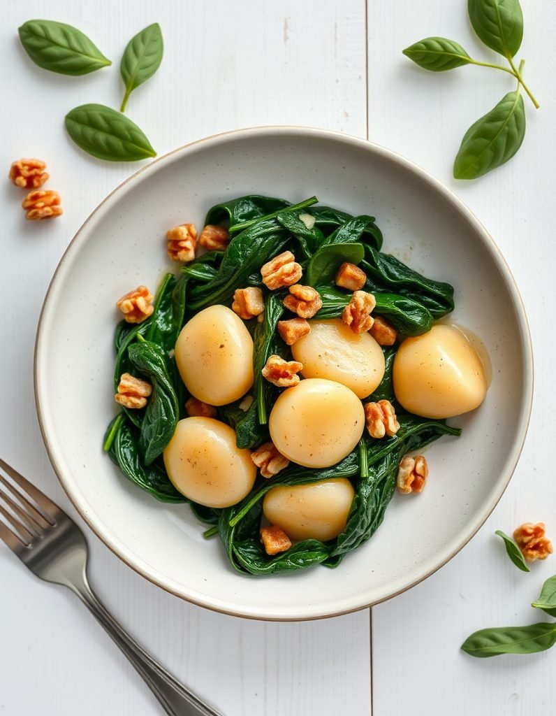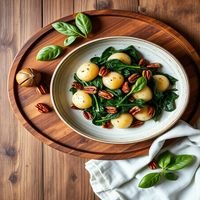 Handmade potato gnocchi with spinach and pecan nuts