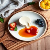 Silky vanilla panna cotta served with seasonal fruit coulis and fresh mint leaves.