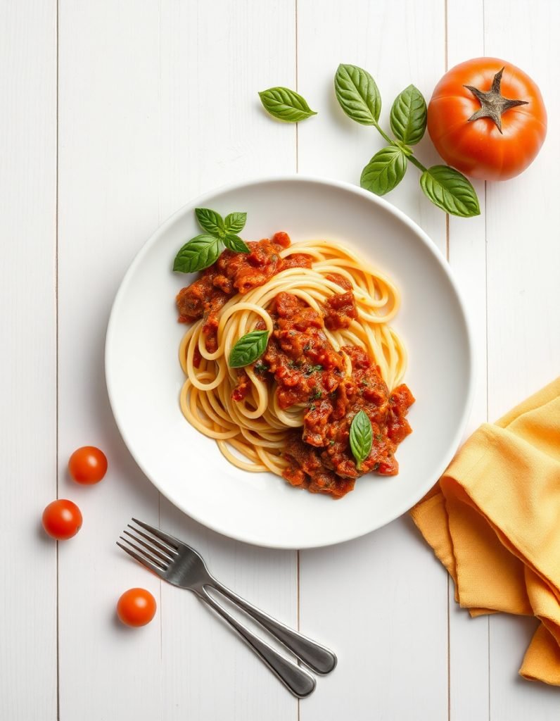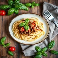 Pasta with minced meat, tomato, and fresh basil leaves