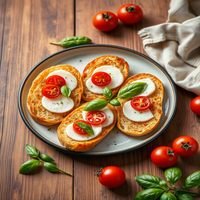 Baked bread slices with fresh mozzarella, cherry tomatoes, basil