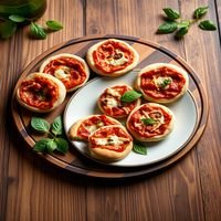 Assortment of mini pizzas served on a wooden tray